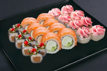 Ролл карибы с авокадо 1/2, ролл канада 1/2, ролл карибы 1/2, филадельфия классика 1/2.