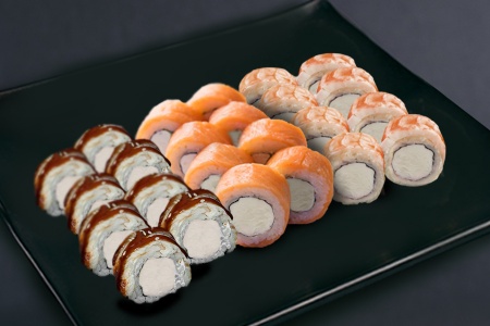 Ролл карибы с авокадо 1/2, ролл канада 1/2, ролл карибы 1/2, филадельфия классика 1/2.